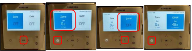 - Press the Right Arrow (►) to highlight the right-hand panel (DHW) in blue.