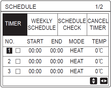 5. Navigate across to highlight Start/End/Mode/Temp, using the Up & Down arrows to adjust.